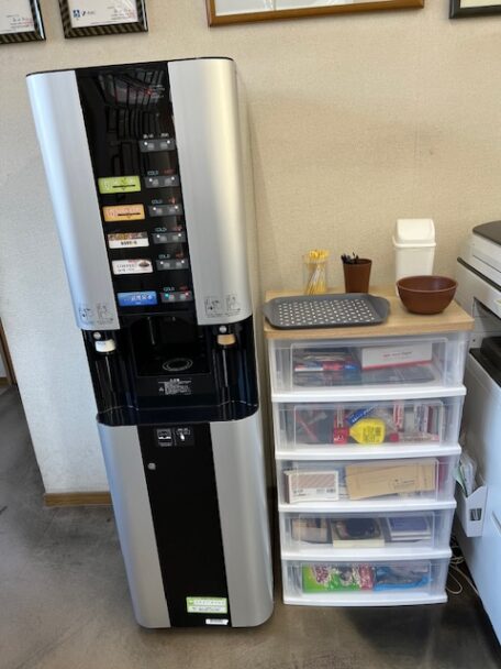 マルチドリンクサーバーを設置しました。水、お茶2種類、コーヒー2種類、それぞれHOTとCOLD、濃いめ、熱いめも選べます。お客様と従業員は自由に飲めます。一息ついて、ティータイムを楽しみましょう。